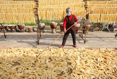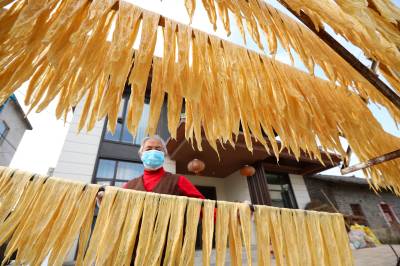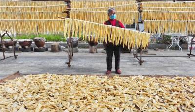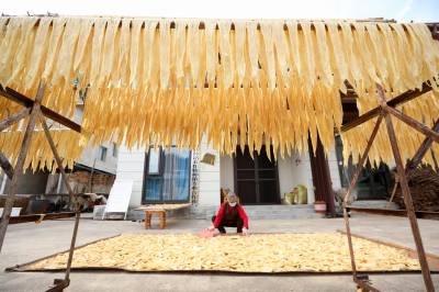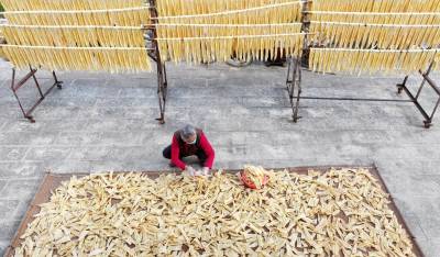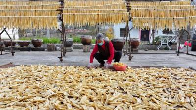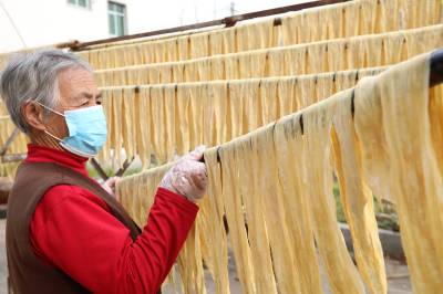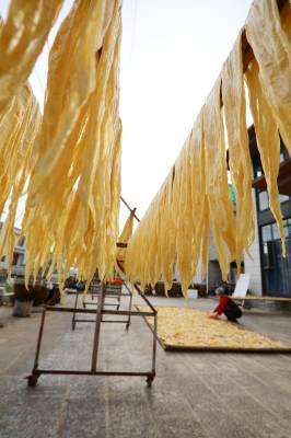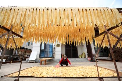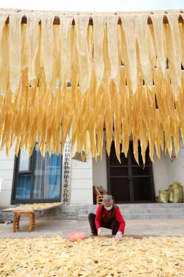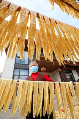 2025年11月30日,十堰市奕盛农产品电子商务有限公司工人在晾晒手工豆油精,该公司位于房县白鹤镇赤岩村。