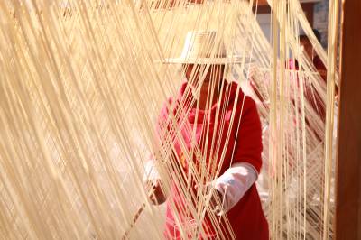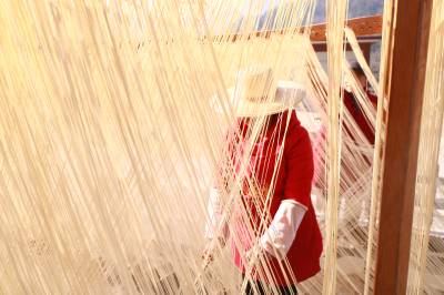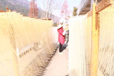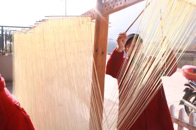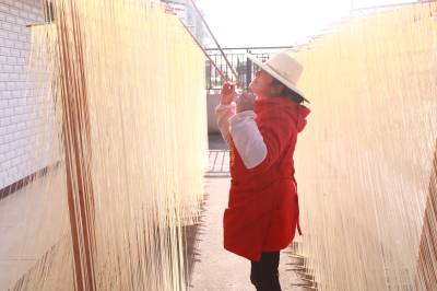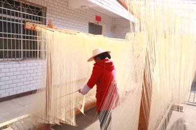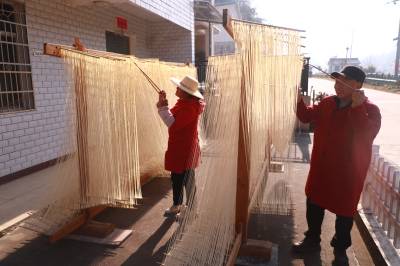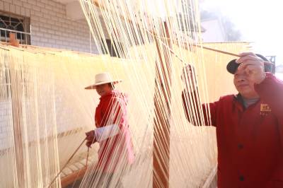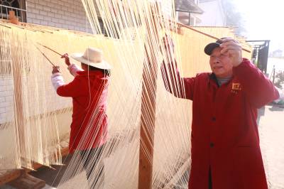 12月6日,暖阳高照英山县乡村,村民家家户户都在做手工油面,面架上细如蚕丝的油面越抻越长,村民脸上笑开花,年味也逐渐浓起来。