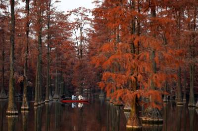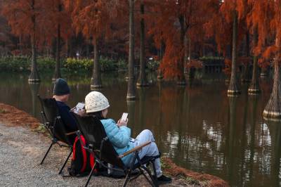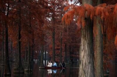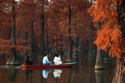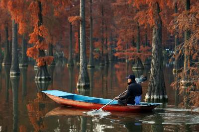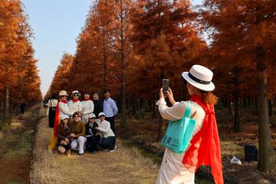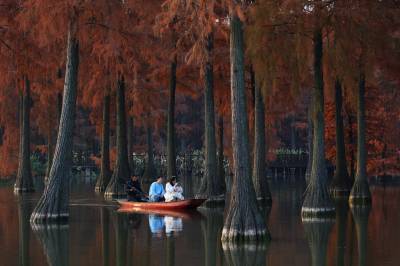 2025年12月8日,初冬暖阳下,武汉涨渡湖湿地“水上森林”色彩斑斓,上万棵池杉红叶似火,成为一道靓丽的风景。