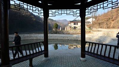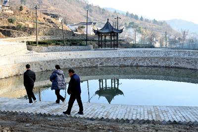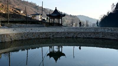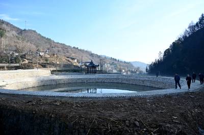 2025年12月16日在湖北省十堰市郧阳区白桑关镇高源村拍摄的维修加固后的水塘。冬修水利正当时。在郧阳各地,水利部门利用冬闲时节维修库塘堰渠,为来年的农业生产打下坚实的水利基础,赋能乡村振兴。视界网王涛摄