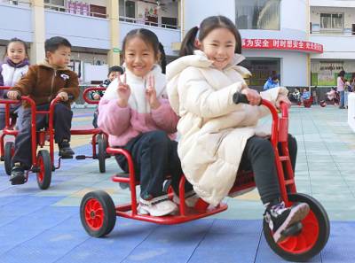 单人专车、双人漫步车、三轮车、多人协力车……幼儿园里投放的一大批游戏材料,让骑行体验成为最受欢迎的游戏活动。孩子们或独立驾驶,或协作前行,小小的身影在赛道上穿梭,俨然一副专业赛车手的模样。“我最喜欢和好朋友一起骑双人车!”5岁的乐乐兴奋地说,小手紧紧握着车把,脸上洋溢着自豪的笑容。旁边的晨晨则展示着自己的“三轮车技”:“我能绕着操场骑三圈都不累!”孩子们在游戏中不仅锻炼了身体,更学会了分享、协作和规则意识。