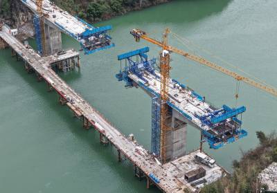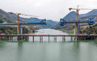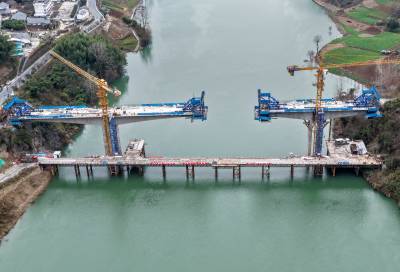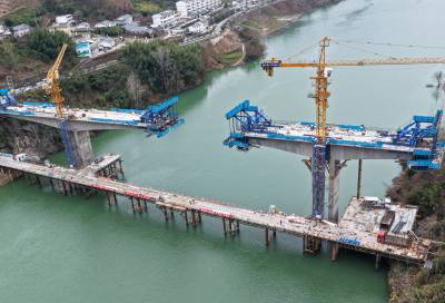 2025年12月21日,十堰市竹山县,接连楼台乡白莲村和文峰乡东钦村的钦峪堵河大桥建设工地,工人正在紧张施工。长期以来,因堵河阻隔,两乡数万群众依靠渡船往返彼岸。乘渡不仅危险,而且费时,出行极不方便。为彻底解决群众出行难,近年来,竹山县已先后完成“渡改桥”、“渡改路”工程20多处,在建“渡改桥”工程3处。