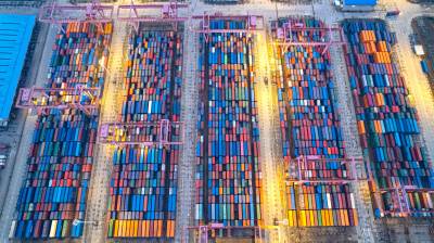 图为2025年12月21日,湖北省武汉阳逻港无人驾驶集卡有序穿梭,高大的岸桥在系统指挥下精准抓取集装箱,操作员在远程控制室轻推手柄,便能同时操控数台龙门吊,数十吨的集装箱举重若轻,呈现出一派繁忙景象。