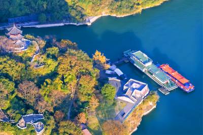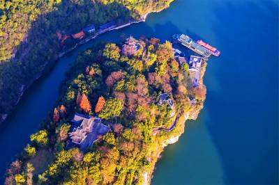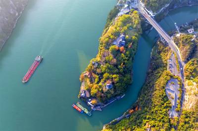 2025年12月8日,在宜昌市夷陵区境内的长江西陵峡口,层林尽染的山丘环抱一江碧水,“水至此而夷、山至此而陵”的峡江风景美不胜收。