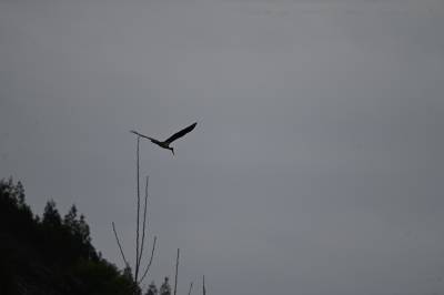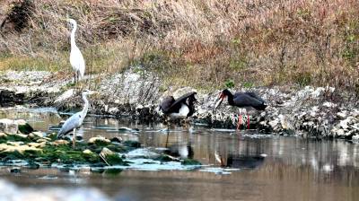 黑鹳是鹳形目鹳科鹳属鸟类,俗称乌鹳、钢鹳、老鹤 。黑鹳头、颈和脊均呈黑褐色,故名黑鹳。 黑鹳上体羽黑色、并带有绿紫色金属光泽,胸腹部羽白色;嘴、腿均红色;两性相似;成鸟嘴长而直,基部较粗,往先端逐渐变细;脚长,前趾基部间具蹼,虹膜褐色或黑色,眼周具裸露皮肤,裸皮红色;幼鸟头、颈和上胸褐色,颈和上胸具棕褐色斑点,嘴、脚褐灰色或橙红色,为国家一级保护野生动物,素称鸟类大熊猫。当日在湖北省十堰市郧阳区安阳镇居家河水库下游发现6只黑鹳和其他鸟类。2025年12月23日在湖北省十堰市郧阳区安阳镇居家河水库下游河道拍摄的两只黑鹳和两只白鹳在河边觅食。视界网王涛摄