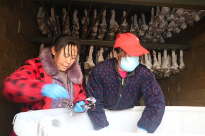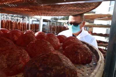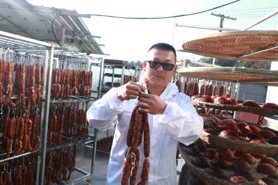 2025年12月27日,笔者在湖北省英山县杨柳湾镇土门河村看到,回乡创业青年柯常安的作坊里,太阳下彤红的腊肉、腊肠、火腿、猪血豆腐粑等腊味琳琅满目、鲜艳夺目。 柯常安介绍,这个作坊是今年7月投资200多万建设的,目前主要开发制作“山里腊味”,还有几个工人在给他帮忙,春节临近,这里呈现一片繁忙的景象。