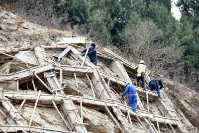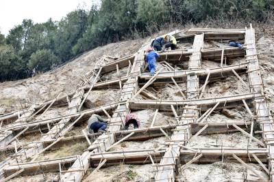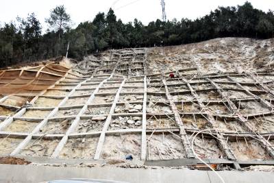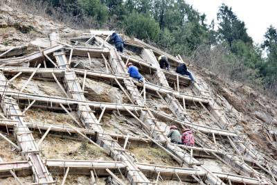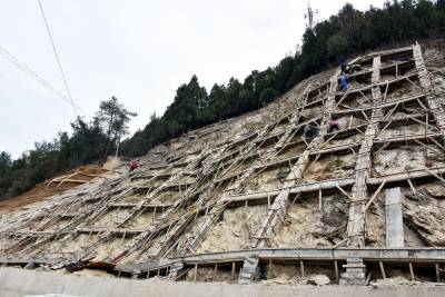 2025年12月26日,十堰市郧阳区技术工人正在209国道旁修复滑坡体生态工程。今年秋季郧阳区遭遇50年一遇的60多天连续降雨,造成郧阳区境内5639公里的公路两侧山体遭遇不同程度滑坡。郧阳区公路部门组织人力、物力、财力进行滑坡体生态修复工程建设,人工种植灌木恢复公路两旁高切坡生态环境。