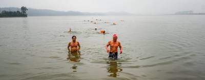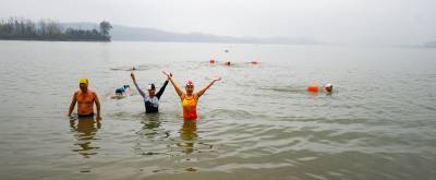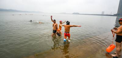 > 嘉鱼冬泳队员严寒中畅游庆元旦