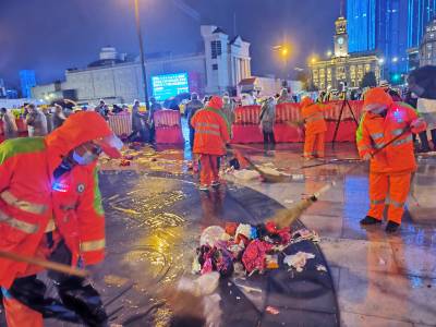 2026年1月1日凌晨15分,武汉市江岸江汉两区环卫工们,在寒冬风雨低温中,对"你好,2026"武汉跨年光影秀圆满结束后的江汉关广场和江汉路等现场,及时进行了新年首日保洁。