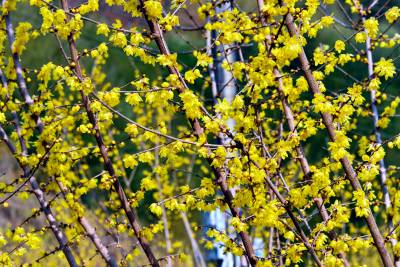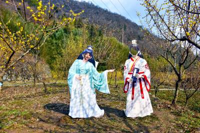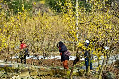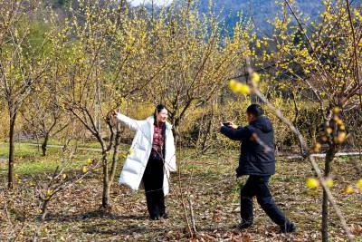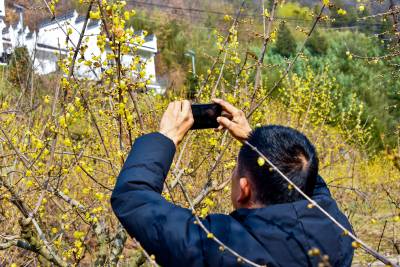 野生腊梅花盛开游客踏雪来