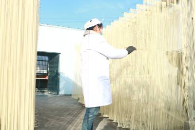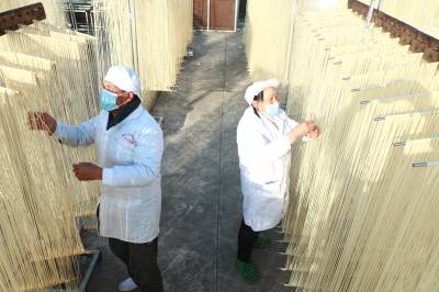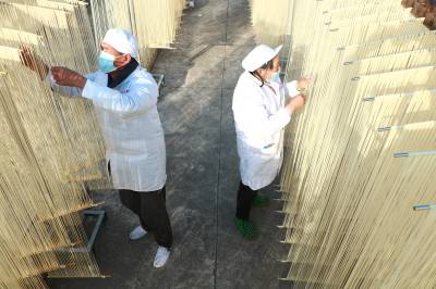 2026年1月10日,走进位于湖北省英山县城金家铺镇黄林冲村的湖北玉皇尖农业,院内工人在制作手工油面。一旁,工作人员正在进行电商直播,现场呈现一片繁忙景象。