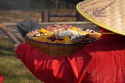现场锣鼓喧天,披红挂彩的年猪巡游仪式感拉满,舞龙舞狮、湖北大鼓等黄陂非遗表演轮番上演,引得游客纷纷驻足喝彩。核心菜品黄陂抬格子香气扑鼻,本地散养黑猪肉搭配时令蔬菜蒸制,肥而不腻,再加上黄陂三鲜、手工腊肠等19道农家菜,让食客大快朵颐。