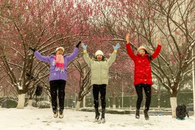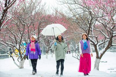 初雪落梅俏,这是武汉最浪漫的开场,清晨步行至泛海商务区,偶遇小孩,大人,和外地游客,他们在雪中一边赏梅,一边舞起来,高兴的像个小孩跳起来了。特别是外地游客对着满枝的雪梅不停赞叹。好一个武汉啊!