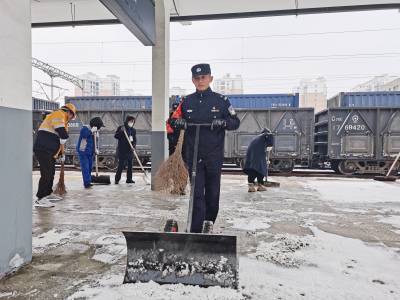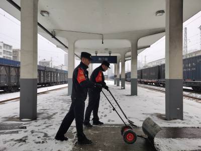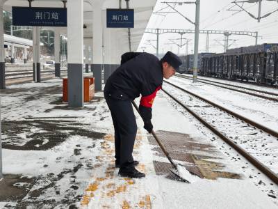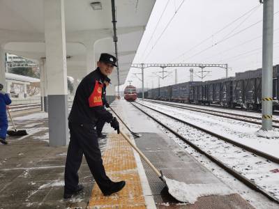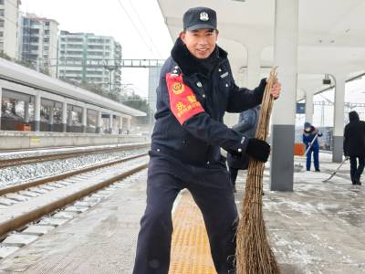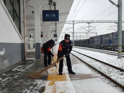 1月20日,雨雪冰冻天气来袭,襄阳铁路公安处荆门站派出所民警联合车务、电务等单位和部门及时清扫站台积雪,确保旅客出行平安。