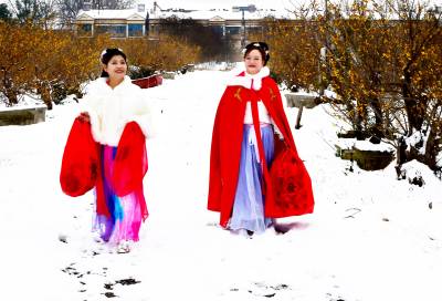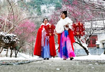 2026年1月22日,两名身穿汉服的游客在三国故事的源头——湖北省襄阳市南漳县水镜庄游园。