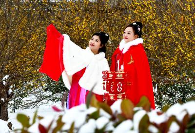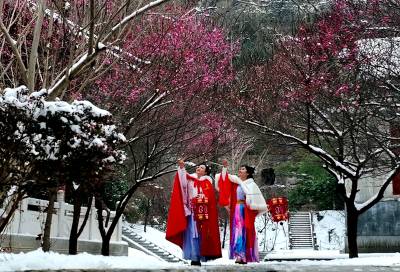 水镜庄的梅花最富诗意。这里曾是司马徽隐居授徒之地,一草一木仿佛都浸润着千年文脉。两位身着汉服的女子穿行梅林,宽袖轻拂过积雪的枝桠,衣袂飘飘,与古亭老梅相映成趣。她们时而驻足细嗅梅香,时而俯身拾取落英,举手投足间,恍若穿越时空,与这片土地上千年的风雅相遇。