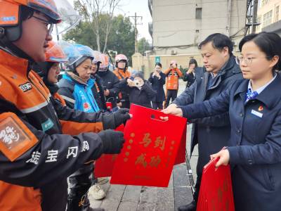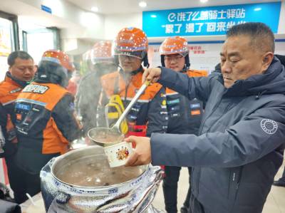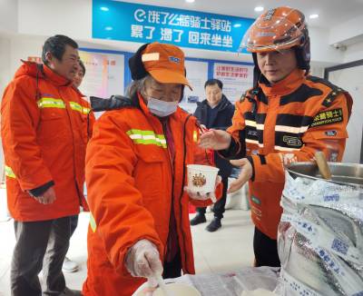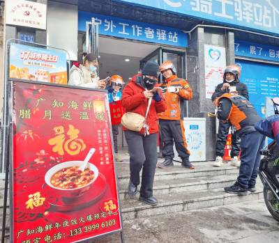 1月23日,在腊八节来临之际,武汉市江汉区汉兴街道玉兰里社区携手辖区企业广知海鲜酒家、建设银行武汉常青南园支行,在金雅公寓饿了么骑士驿站开展腊八送福活动,为辖区内新就业群体及户外工作者送上热腾腾的腊八粥、喜庆的迎新春联,以暖心关怀传递节日温情,让奔波在城市中的新就业群体感受家的温暖,收获满满归属感。