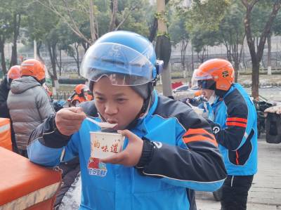 为了让新就业群体喝上一碗暖心暖胃的腊八粥,广知海鲜酒家的厨师团队早早备料、精心熬煮,精选大米、红豆、花生、红枣等多种食材慢火煨炖,让每一碗粥都软糯香浓、营养满满。上午9点,活动正式开启,外卖骑士、快递员、环卫工作者等新就业群体与户外工作者陆续来到驿站,社区工作人员与志愿者们热情相迎,将温热的腊八粥递到大家手中,送上建设银行准备的新春对联,同时送上节日祝福,一句句贴心的叮嘱、一张张温暖的笑脸,让驿站内外暖意融融,年味十足。