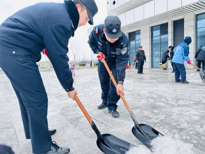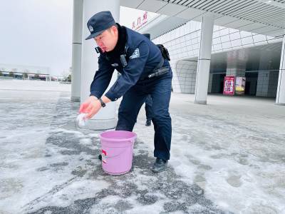 1月23日,襄阳铁路公安处天门站派出所民警为保障旅客出行平安,联合地方力量抛洒融雪剂、清理进出站口积雪。