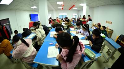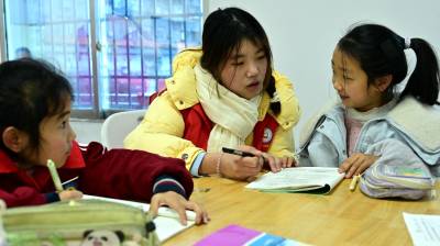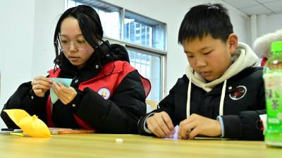 2026年1月30日,湖北省十堰市郧阳区众行社会工作服务中心在团区委的指导下,在城关镇体育场社区幸福驿站举办寒假公益托管班,这是大学生志愿者在辅导学生作业、作折纸手工。视界网王涛摄