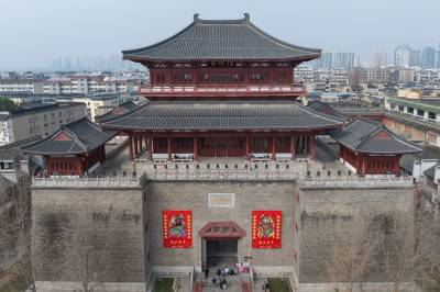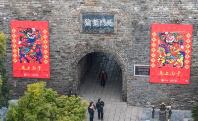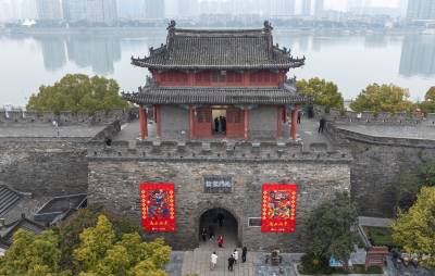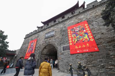 1月31日,襄阳古城临汉门、昭明台悬挂起了大型非遗年画,古城街头年味渐浓。据了解,临汉门上的年画来自襄阳本地的国家级非物质文化遗产老河口木版年画,画面形象是传统民俗里的门神。昭明台上的年画在老河口木版年画基础上进行创新性手绘创作,让传统门神形象在创新表达中焕发新生。色彩鲜艳、造型生动的年画吸引了不少游客驻足观赏、拍照“打卡”。