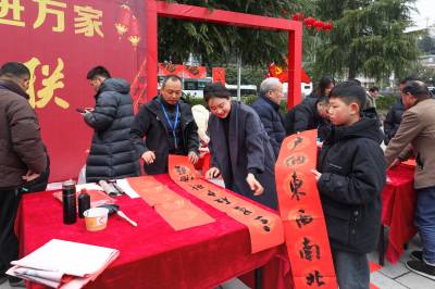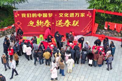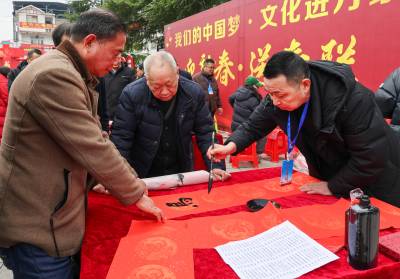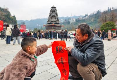 2026年2月1日,中央宣传部、文化和旅游部、国家广播电视总局、中央广播电视总台、中国文联主办的2026年“我们的中国梦——文化进万家”活动启动仪式在湖北省恩施土家族苗族自治州恩施市芭蕉侗族乡大坝广场举行,侗族鼓楼前的广场上,数千群众齐聚,书法家现场挥毫泼墨,免费为群众写春联。(视界网 张远明 摄)