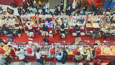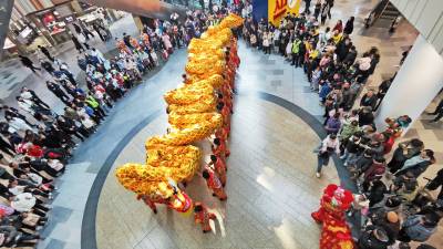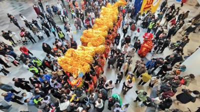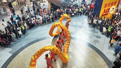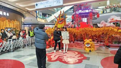 2026年2月1日,在湖北省武汉市硚口区一家大型商场里,众多市民前来逛马年市集、观赏非遗舞狮舞龙表演、选购新春饰品、采购新鲜蔬菜等,呈现出一派喜庆热烈的春节氛围。