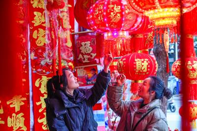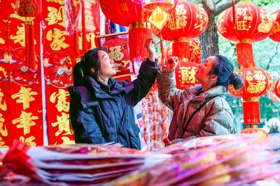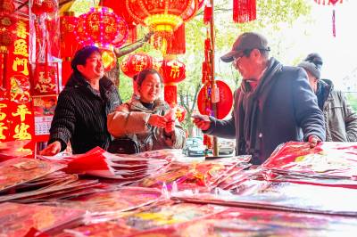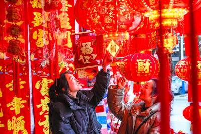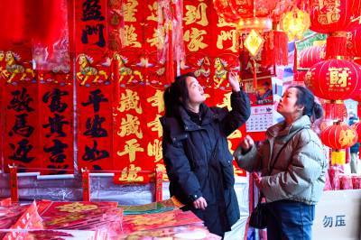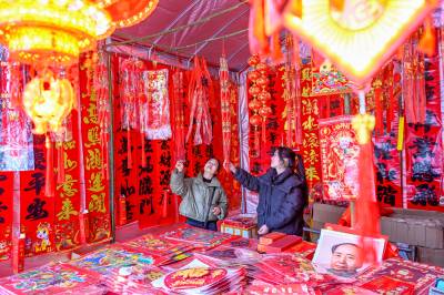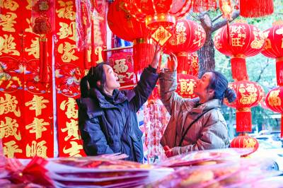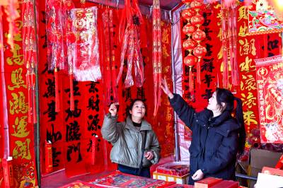 2026年2月3日,在湖北省黄冈市浠水县年货市场,市民在选购年货,呈现出红红火火迎新春的喜庆氛围。