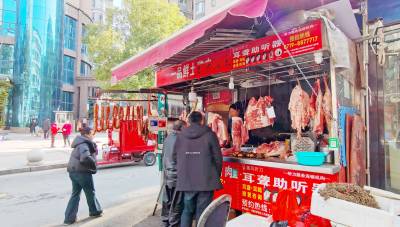 到了腊月半,要把年货办。在十堰城区街头,人们纷纷走近土猪肉铺面,选购过年的“大菜”,腌腊肉,备足年节用的主菜。图为人们在三堰擂鼓台一处肉铺选购乡村土猪肉。(视界网 周宗华 摄)
