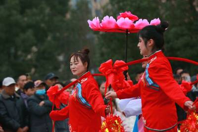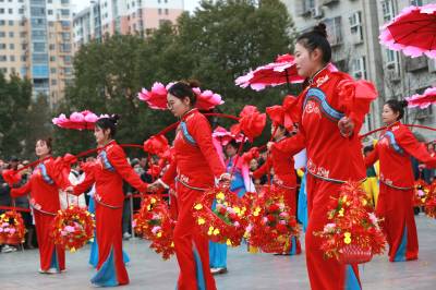 下午2时许,展演在欢快的锣鼓声中拉开帷幕。首支登场的彩船队尤为引人注目:五彩绸缎装饰的船身流光溢彩,船头“福”字灯笼随风轻摇,艄公与船娘子踏着轻盈的步伐,一唱一和间演绎着乡村丰收的喜悦。随后上场的腰鼓队则展现出截然不同的热烈气象——数十名身着红衣的表演者整齐列阵,鼓槌翻飞,铿锵的鼓点如春雷滚动,激越的节奏瞬间点燃全场气氛。