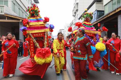 紧接着,肩挑各式花篮的表演队伍翩然而至。她们步履轻盈,肩上的花篮随着民歌小调有节奏地摆动,宛如春日田野里摇曳的花朵。压轴登场的舞龙舞狮将活动推向高潮:彩龙在队员们默契配合下蜿蜒腾挪,时而“盘龙望月”,时而“金龙摆尾”;金黄与火红相间的醒狮则扑闪着眼睛,跳跃翻转,活灵活现的表演赢得掌声不断。