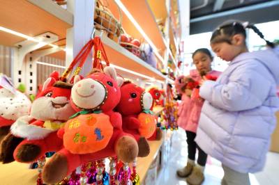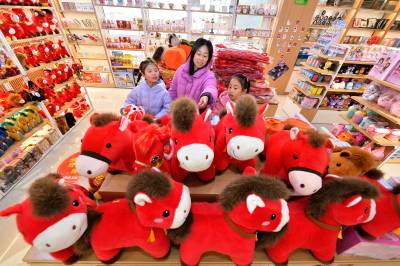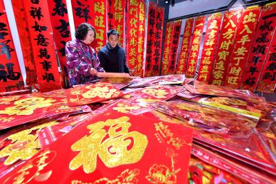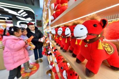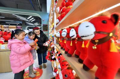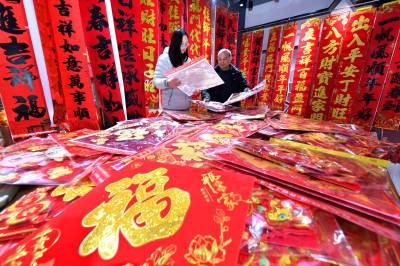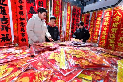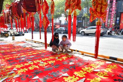 春节临近,保康县的年货市场日渐红火,当地群众纷纷挑选春联、福字、马年玩偶等节日饰品,红红火火迎新春。(视界网杨韬 赵硕 摄)