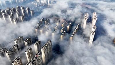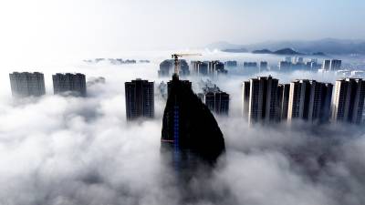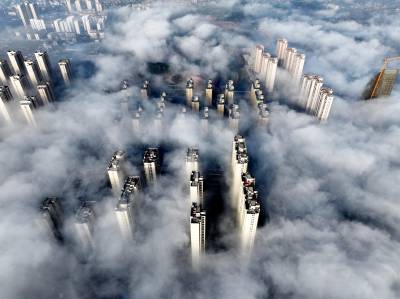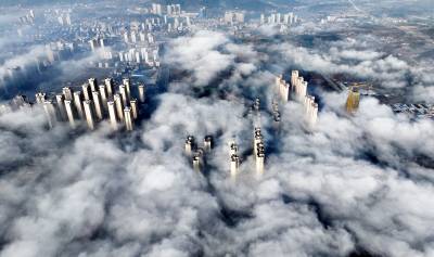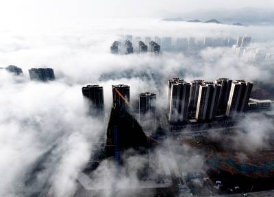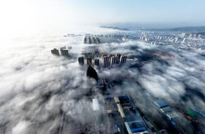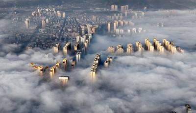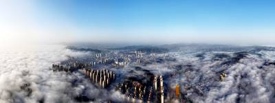 雾气如轻纱般缠绕山峦、楼阁与流水,将整座县城笼罩在一片朦胧梦幻之中。远山若隐若现,建筑错落点缀,似海市蜃楼,又似水墨丹青,令人仿佛步入云端仙境。