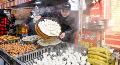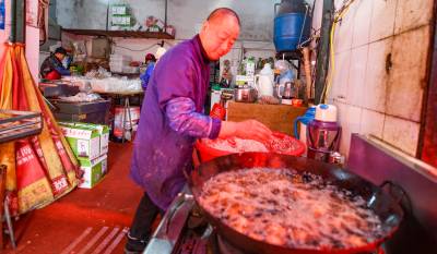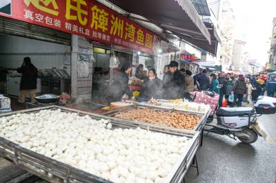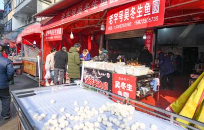 2月12日是农历腊月25。嘉鱼县城区鱼岳镇考棚村鱼圆一条街人流如织,热闹非凡沿街排列的老字号吴冬生鱼圆、夏名刚簰洲鱼圆等近20家鱼圆店正在赶制年货,现场生产销售,同时外销打包发往外地。生炸鱼圆子,出锅蒸好簰洲鱼圆、鱼糕热气腾腾、香飘四溢,扑鼻而来,浓浓的年味,吸引八方来客。