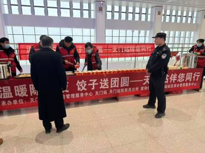 2 月 15 日,天门站派出所联合车站单位,在候车室开展 “温暖除夕夜,饺子送团圆” 活动,为旅客送上热饺与暖心帮扶,护航春运归途。