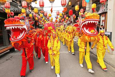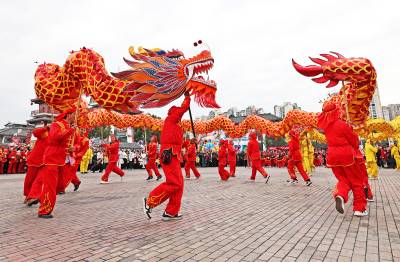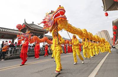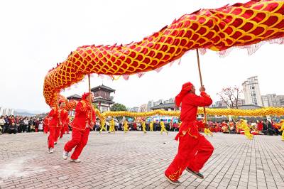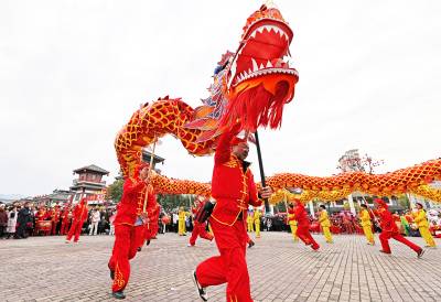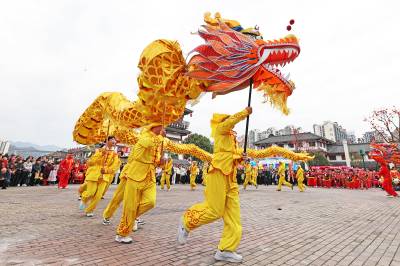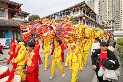 2026年2月18日,十堰市竹山县,“我家就在桃花源·欢天喜地过大年”春节民俗展演活动,在城关镇桃花源街区火热进行。滚龙、狮舞、彩船、秧歌、挑花篮等,由各乡镇和社区精心组织的民俗文艺节目轮番上演,为八方游客和当地市民献上一场场精彩的新春文化盛宴。