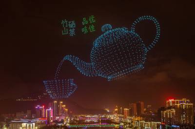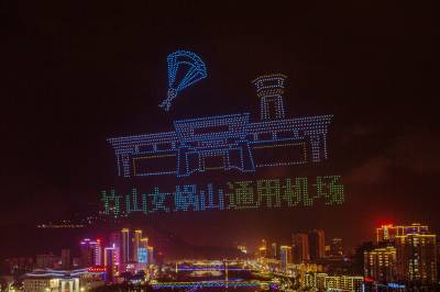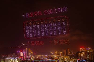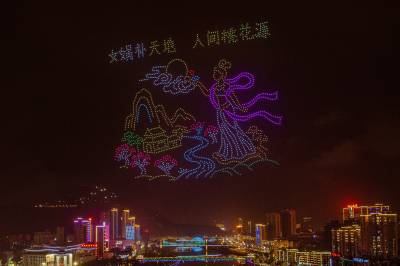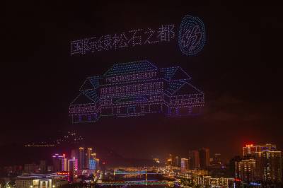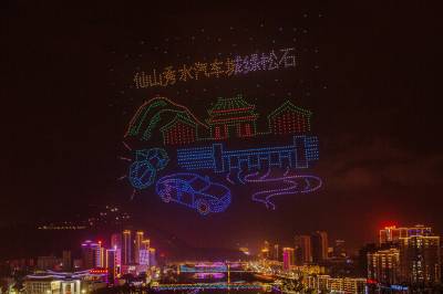 伴随着动感的音乐节拍,无人机编队如流萤般变幻阵列,时而汇聚成憨态可掬的卡通图案,时而排列组合为立体灵动的三维造型。“国际绿松石之都”“十星发祥地 全国文明城”“仙山秀水汽车城绿松石”“女娲补天地 人家桃花源”等十二幕光影画卷次第展开,全方位展现了竹山独特的地域文化魅力。