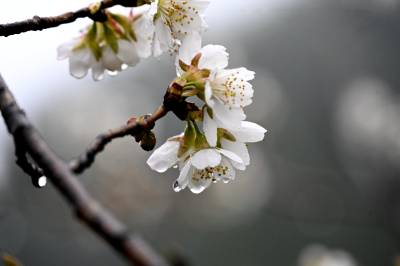 2026年2月28日在湖北省十堰市郧阳区茶店镇樱桃沟村拍摄的雨中盛开的樱桃花。湖北省十堰市郧阳区茶店镇樱桃沟村种植有几万株樱桃树,初春时节,樱桃花开、漫天飞雪,美不胜收,每天吸引大量游客前来观赏。视界网王涛摄