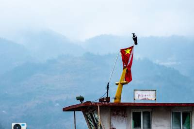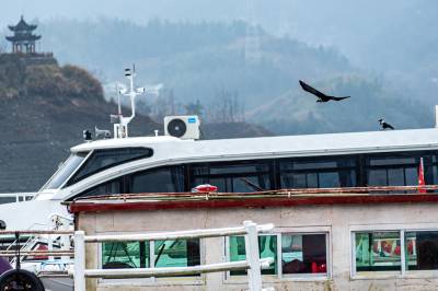 连日来这两对白颈鸦每日清晨与傍晚准时在湖面周边活动,时而停留在岸边、渡口船旋上、时而低头觅食,时而低空盘旋飞行,状态十分稳定。
