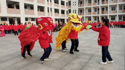 3月4日,马年新春开学第一天,枝江市南岗路小学锣鼓喧天,歌声阵阵,学生在非遗文化传承人的示范、指导下,有板有眼学习舞狮,划起了彩莲船,欢欢喜喜闹新春。视界网刘卫东摄