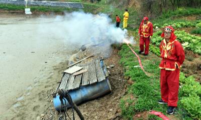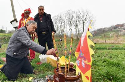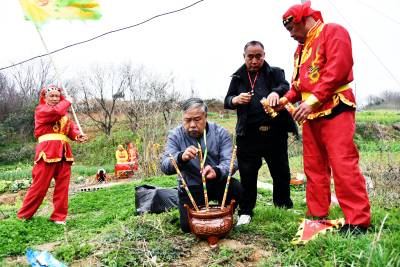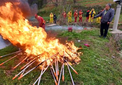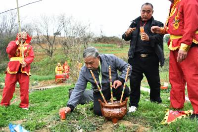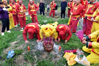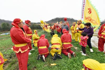 下午后生们身穿红黄彩色戏装最后一次在文化广场上表演舞龙后,沿着村上道路敲锣打鼓进行巡游,向倒龙地点行进,最后来到倒龙仪式地点水库坝上。按照当地传统习俗,摆上香炉,升炮后,70岁的第13代传人李成跪拜上香,上腊烛、拜天地、拜龙灯、烧纸,随后所有仪式进行完毕后。第14代龙灯队传人李善洲、李善忠跪拜烧纸,上香。依照顺序李家班龙灯队的后生们3人一组跪拜烧纸,上香。仪式进行完毕后70岁的第13代传人李成最后一次向双龙三扣首,升炮后倒龙焚烧,来年腊月在扎制新的双龙。 茶店镇蔡家岭村13组李家班龙灯队从扎制草龙、纸龙,布龙,到舞起更有中国传统文化的彩色黄龙和红龙,己有100多年的历史,这样一代又一代的传承下来,在郧阳区也仅此一家。