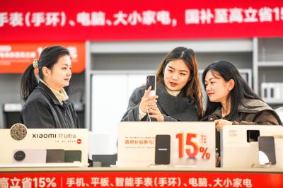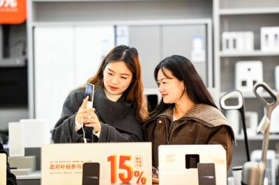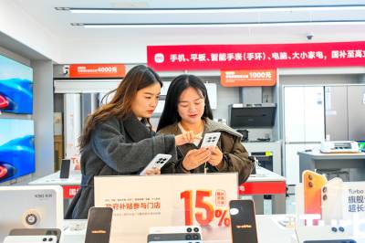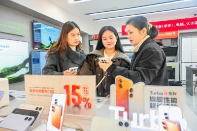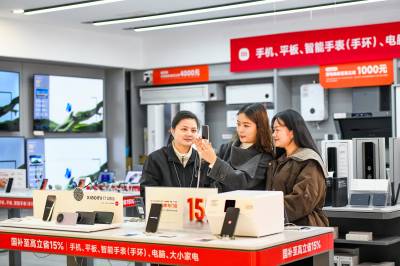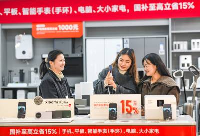 2026年3月6日,湖北省黄冈市浠水县润达商场内,消费者正在一家品牌销售店内选购手机。为落实新一轮以旧换新和国家补贴政策,当地政府与商家积极对接,对手机、平板、智能手表、电脑及大小家电等商品推出最高 15% 的国补优惠,政企协同发力有效激发了居民消费热情,带动数码家电市场持续回暖。