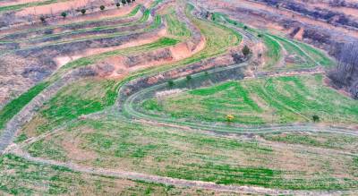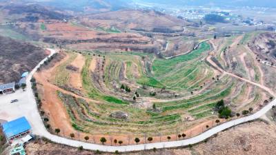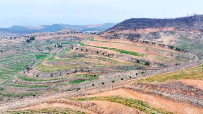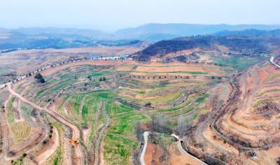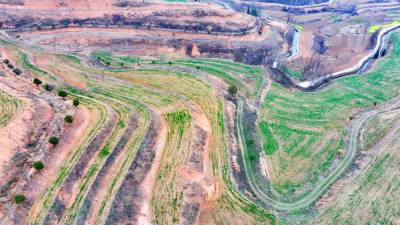 2026年3月6日,十堰市房县军店镇中村小流域,水平梯田环绕山腰,种植的小麦长势良好,带来粮食丰收的希望。