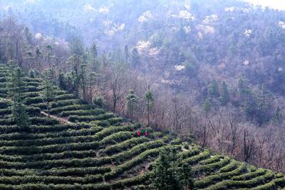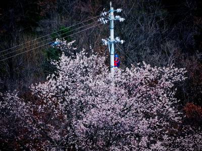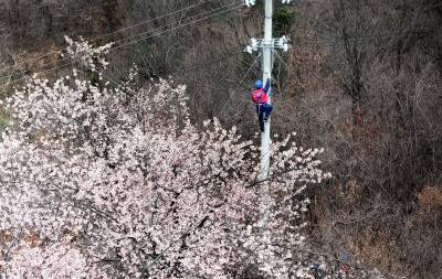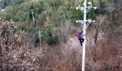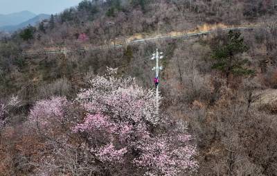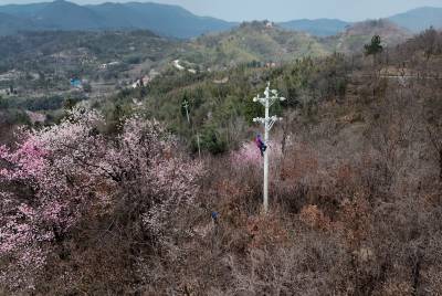 2026年3月11日,在湖北省大悟县三里城镇柏园村五峰山、五岳山之间,漫山遍野的野生樱花竞相绽放,满目翠绿的茶园层层叠叠。 近年来,大悟县大力发展乡村旅游产业,将柏园村万亩茶园与万亩野生樱花谷打造成独具特色的花香茶海旅游观光地。每年3月来该地赏花的游客可达15—20万人次。为助力乡村旅游,大悟县供电公司组织共产党员服务队深入樱花谷和茶园,保障该地用电安全。图为共产党员服务队队员在樱花谷检查线路安全运行情况。