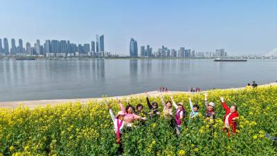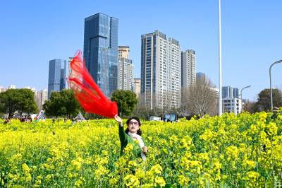 2026年3月11日,湖北省武汉市武昌江滩,金黄的油菜花在长江之畔盛放,与对岸的城市高楼交相辉映,构成一幅春日江城画卷。