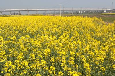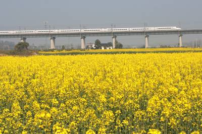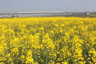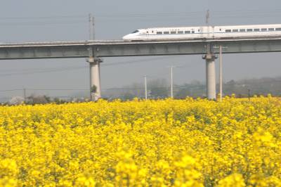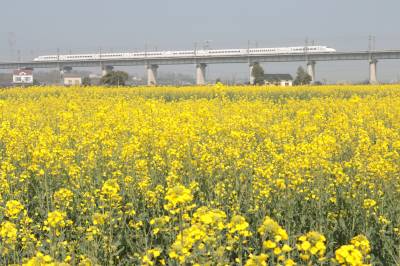 3月11日,一列动车从枝江市赵家冲村通过。阳光明媚,春暖花开,蜜蜂飞舞,油菜花海喜迎各地客人。视界网刘卫东摄