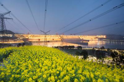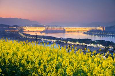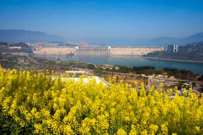 时下,湖北省宜昌市,三峡大坝附近的油菜花盛开,春光明媚,美景如画。