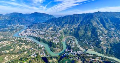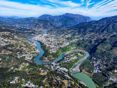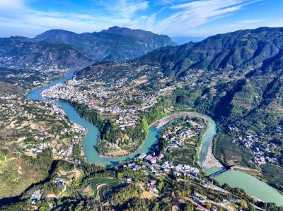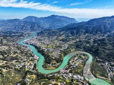 2026年3月12日,湖北省恩施土家族苗族自治州恩施市屯堡乡杨家山村龙王塘,航拍镜头下的清江如一条碧绿玉带,蜿蜒环绕着黛色群山,与错落的民居、层叠的田园、纵横的道路交相辉映,勾勒出一幅山清水秀、生态宜居的壮美画卷。(视界网 张远明 摄)
