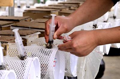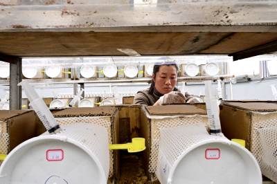 2026年3月15日在位于湖北省十堰市郧阳区柳陂镇高岭村的郧阳胡蜂培育基地温室大棚里,工作人员正在饲喂胡蜂蜂王。