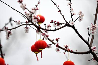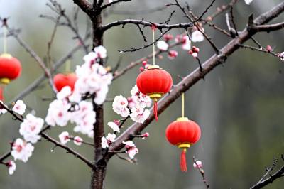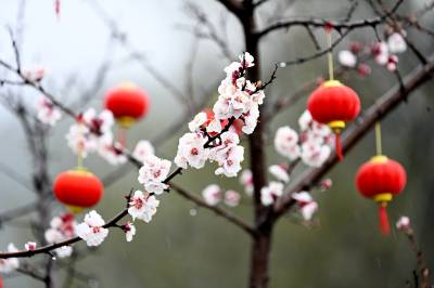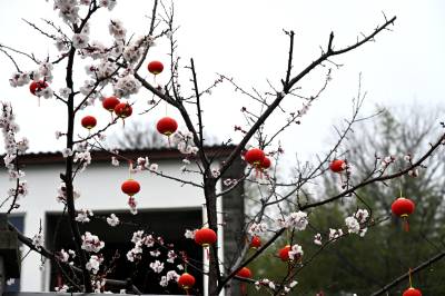 2026年3月17日在湖北省十堰市郧阳区安阳镇横山村拍摄的雨中的杏花。当日在湖北省十堰市郧阳区安阳镇横山村杨安公路边一农户门前,一株杏树上挂满红灯笼,杏花花开正艳,杏花带雨,别有韵味。视界网王涛摄